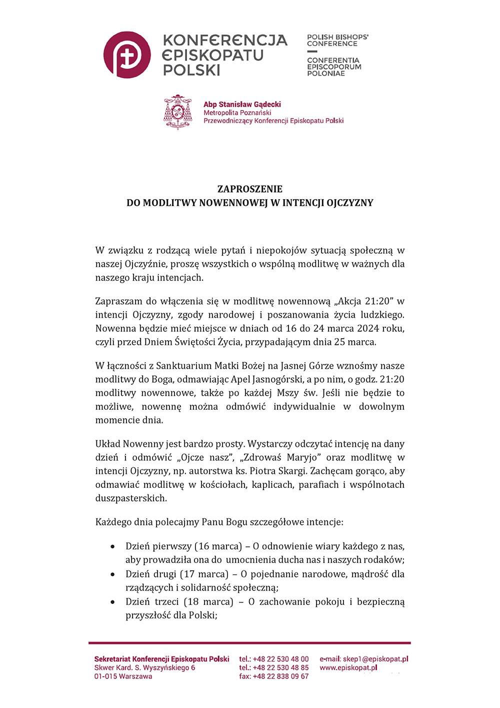 Przewodniczący Konferencji Episkopatu Polski abp Stanisław Gądecki zaprasza do włączenia się w modlitwę w intencji naszej Ojczyzny. Będzie to Nowenna w dniach od 16-24 marca br. za wstawiennictwem św. Andrzeja Boboli i bł. ks. Jerzego Popiełuszki w intencji Ojczyzny, zgody narodowej i poszanowania życia ludzkiego.